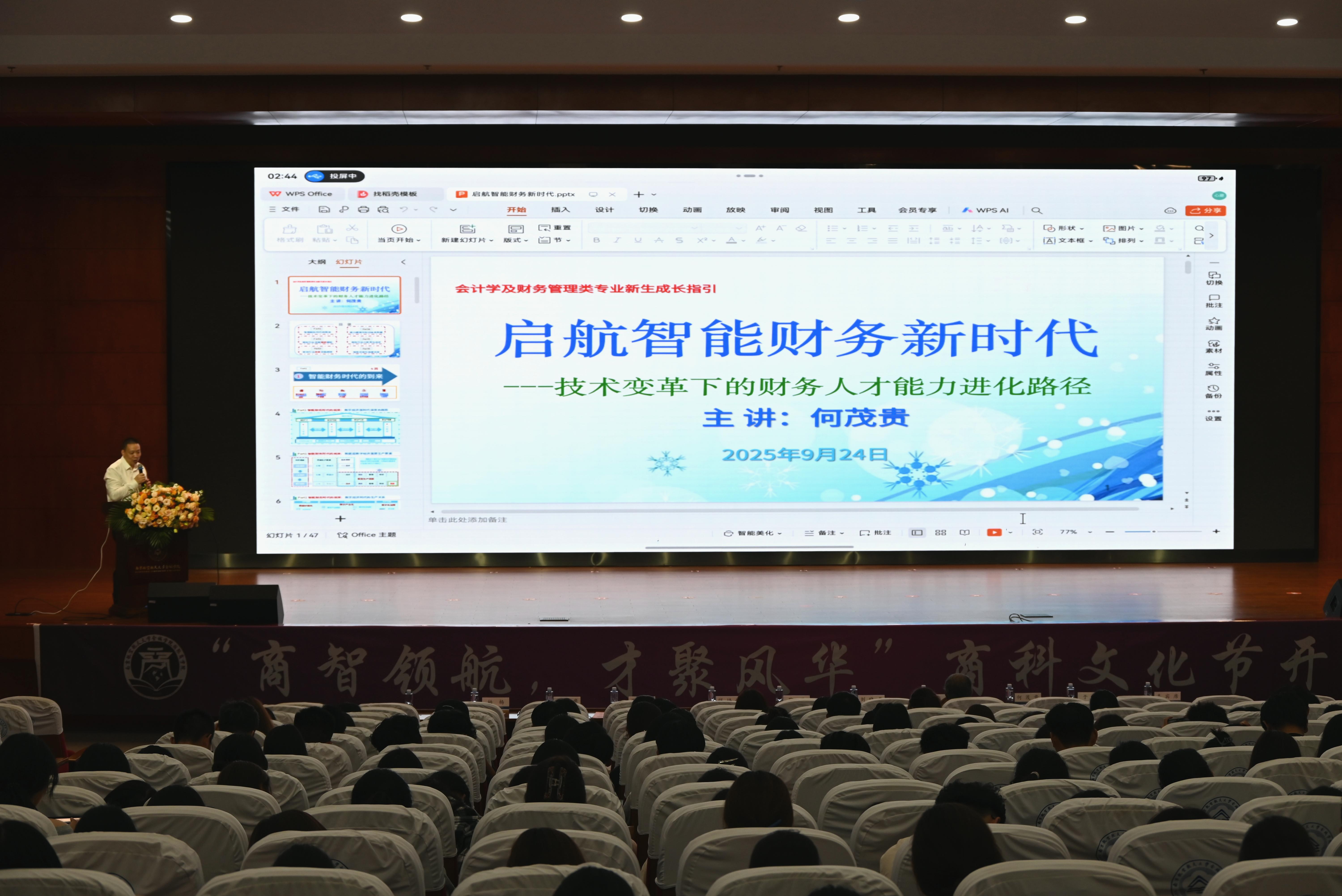 14时30分,备受瞩目的名家讲座主环节正式开启。本次讲座特邀拥有近二十年行业积淀的业界精英——何茂贵财务总监担任主讲。他以《启航智能财务新时代——技术变革下的财务人才能力进化路径》为题,为全场新生带来了一场信息密集、视野宏大的专题讲座。整场演讲紧密围绕“技术变革下的财务人才能力进化路径”这一核心线索徐徐展开,何总监将其分享系统性地划分为六大循序渐进的模块:从宏观层面阐释“智能财务时代的到来”的必然性,到中观层面深入“解析财务行业发展现状”,进而前瞻性地剖析“财务行业未来发展趋势”;在此基础上,重点落脚于学生个人发展,详细讲解新时代财务人才所需的“能力模型与知识体系构建”,并直面技术浪潮,探讨“财务行业AI变革与应对”的策略,最后开放“现场交流与资源支持”。