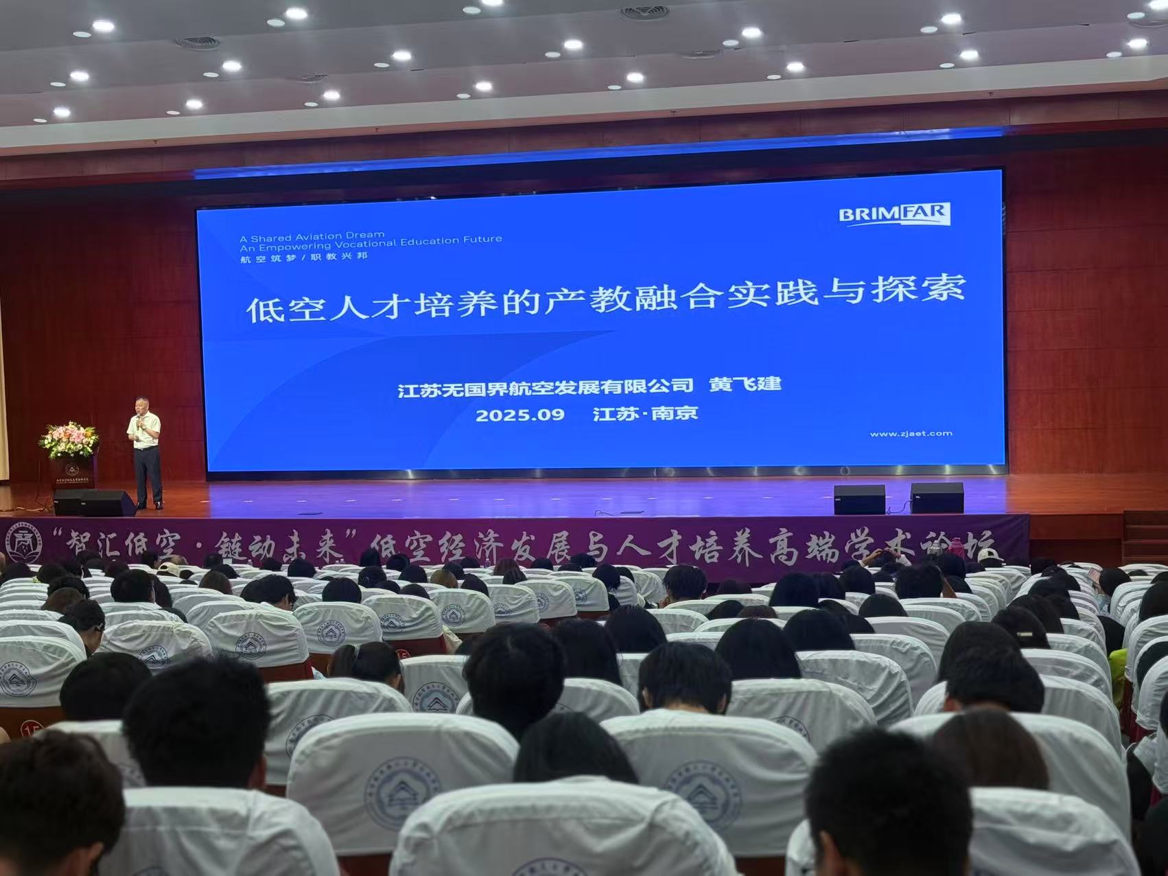 江苏无国界航空发展有限公司董事长、南航金城学院理事黄飞建结合自身实践,分享了《低空人才培养的产教融合实践与探索》。他直言产业的爆发式增长正面临应用型、跨领域人才短缺的瓶颈。他鼓励国际商学院的学子,作为“新文科”代表,应将管理、法律、营销等专业知识与低空经济深度融合,提前做好学习规划。他呼吁高校加快低空经济相关微专业、课程群和产业学院建设,深化校企合作,共同闯出一条低空经济人才培养的新路,为行业输送源源不断的生力军。