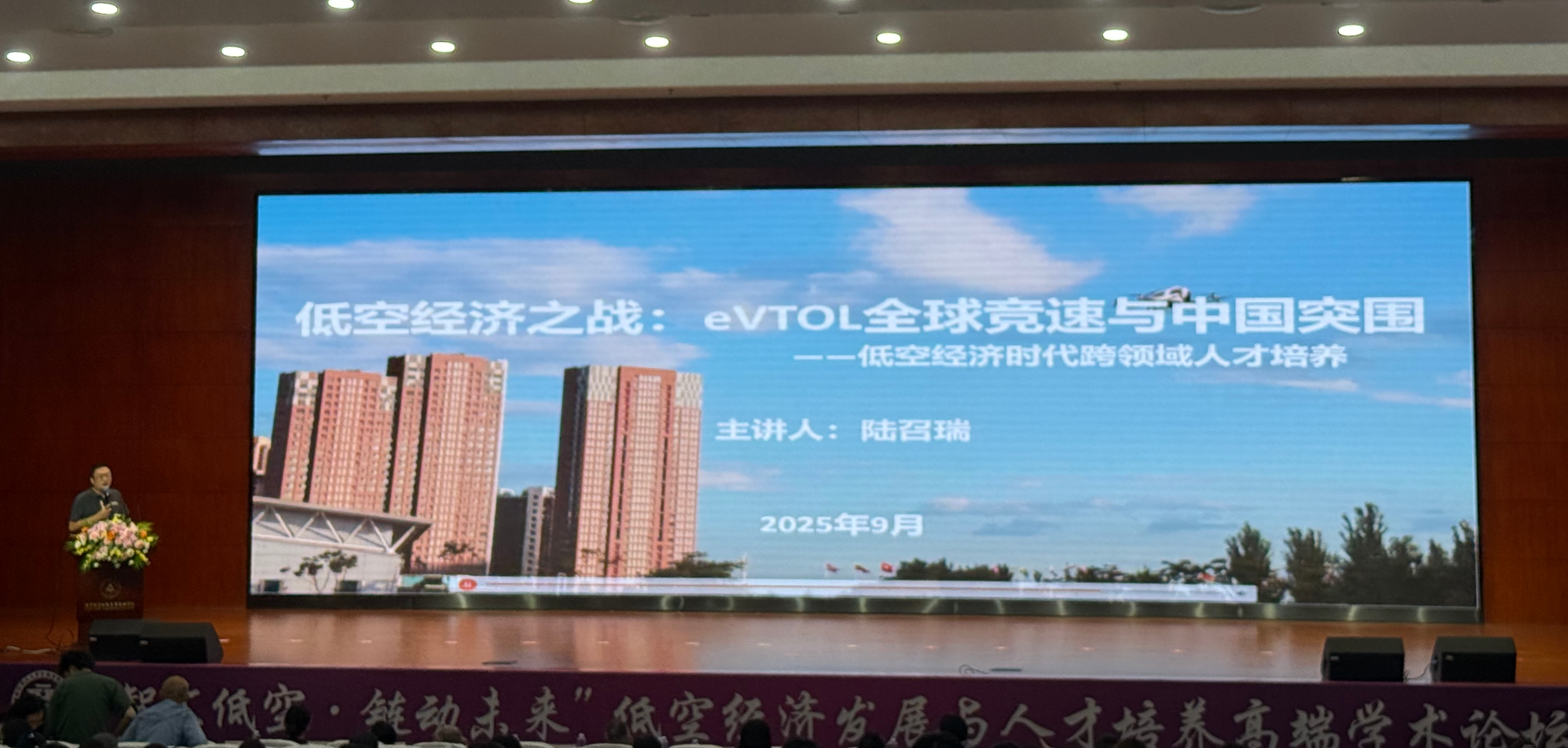 通航国际集团科技副总经理陆召瑞在《低空经济之战:eVTOL全球竞速与中国突围——低空经济时代跨领域人才培养》的报告中,将目光聚焦于当前全球低空竞争的焦点——电动垂直起降飞行器。他分析指出,中国在适航审定领域已“勇敢迈出一大步”,相关企业获得的全球首张型号合格证标志着中国已站上全球竞争的同一舞台。陆总预测,eVTOL的发展将经历关键节点:2030年将迎来规模化出现,2035年实现常态化交付与商业化运营,届时产业将如同今日的新能源汽车,进入不再依赖补贴的良性循环。他强调,商业成功的核心在于飞机研发、供应链保障与市场应用场景三者的协同并进。
