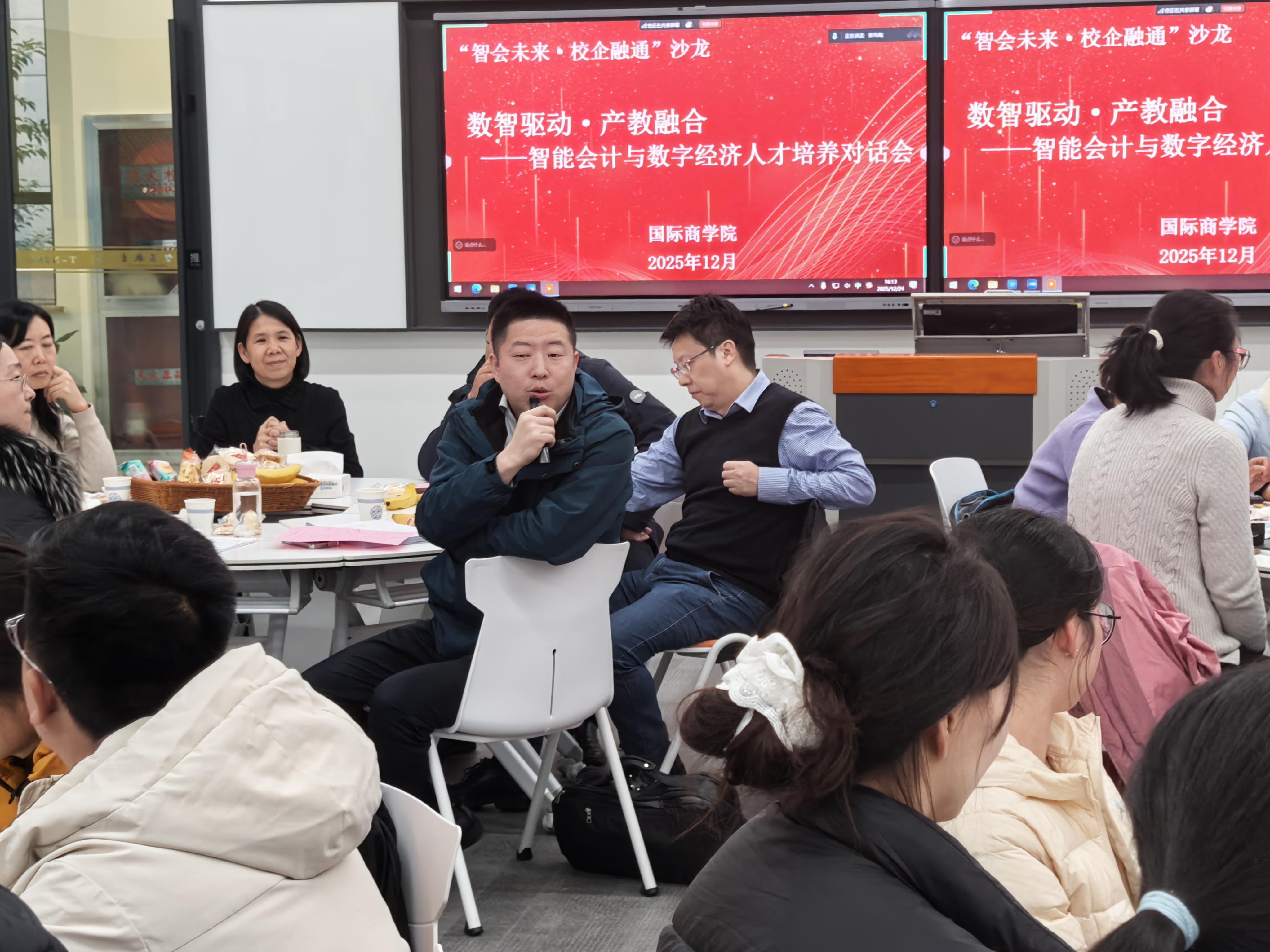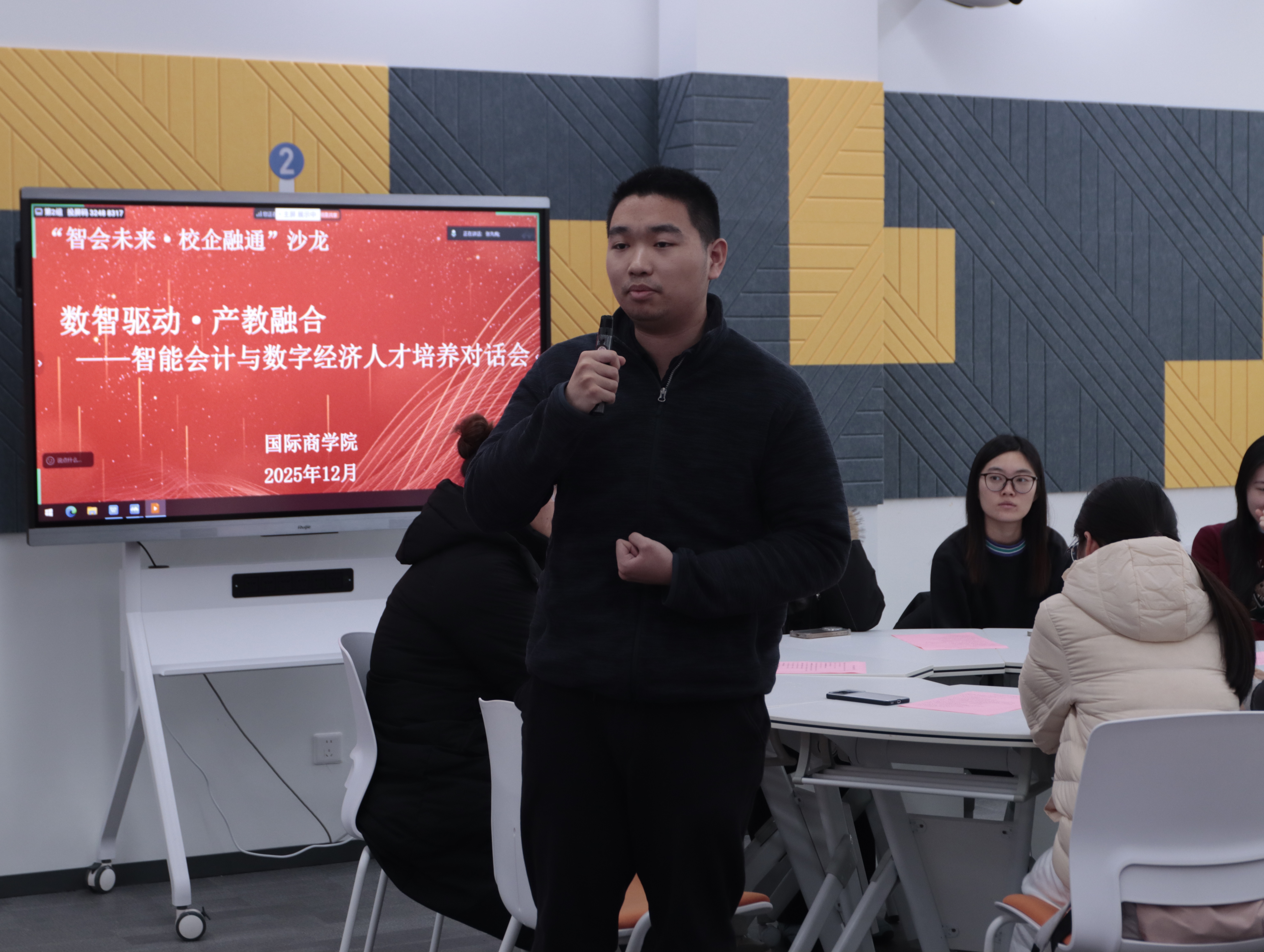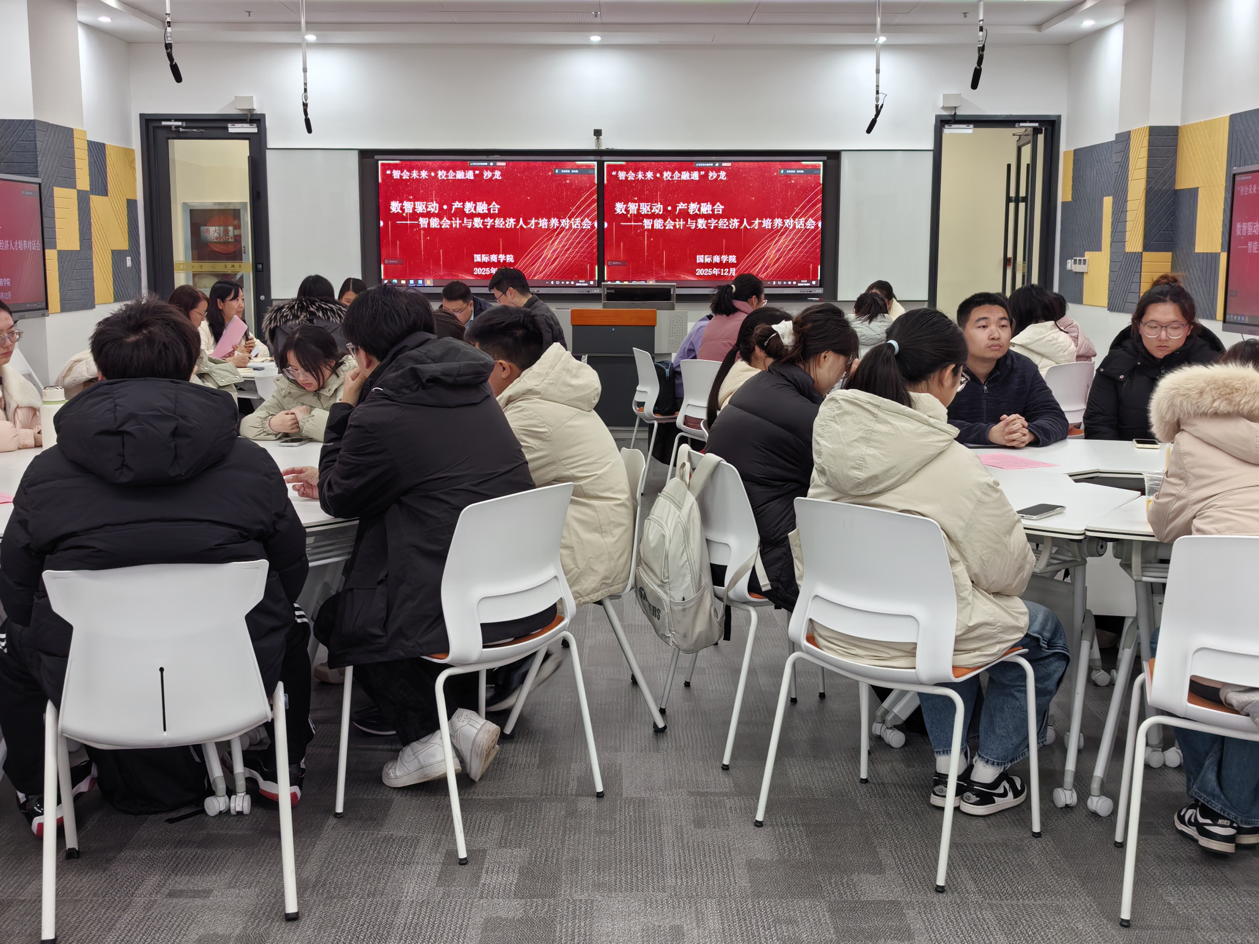 与会专家结合各自领域,分享了极具前瞻性与实践性的见解。王英教授从高等教育研究者的视角,强调了人才培养方案落地实施与培养学生自主学习能力、实践创新能力的重要性。周安丰行长从银行业实际出发,指出国际商学院已将金融科技、区块链等前沿内容融入课程体系,但学生仍需夯实金融基础,培养复合型能力与快速学习素养。惠淼枫总经理以投行业人才标准为例,系统阐述了从专业型到复合型再到领导型人才的三层能力模型,为学生的职业进阶提供了清晰路径。吴玉娟总监结合自身二十余年财务管理工作经验,生动诠释了从传统核算会计向管理会计、业务伙伴转型的趋势,强调了扎实的财务功底、数据分析能力、沟通协同及终身学习意识的不可或缺性。任子宜总经理对关于智能会计发展三阶段(统计、分析、决策)的精辟论述,以及人工智能如何重塑财务工作场景与价值创造的分享,将讨论推向高潮。他特别指出,未来的财务人才必须深度融合业务知识、扎实财务功底与数字素养。